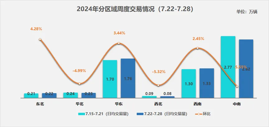 本周,二手车市场的交易情况呈现出明显的区域差异性。具体而言,东北、华东以及西南地区成为了交易亮点,交易量均实现了增长趋势,显示出市场在地区的活跃度和消费者购车热情的回升。其他地区交易量则出现了不同程度的下降。