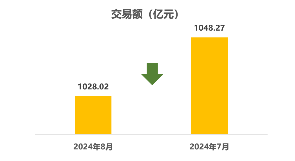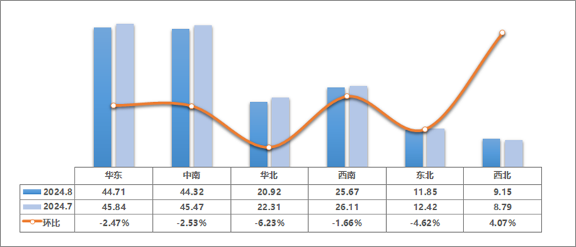 2024年8月,全国六大区中仅西北地区交易量较上月有所增加,其他地区均有不同程度的下滑,其中华北、东北两个地区的降幅相对明显。
