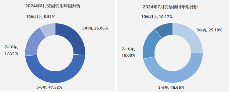 8月份,3年以内、3-6年的份额整体较上月有所增长,10年以上的份额下降较快,市场整体向更年轻化的趋势发展。