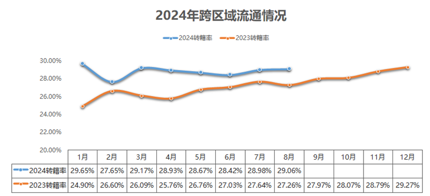 8月份,二手车转籍率为29.06%,环比上月增长0.1%,同比去年同期增长1.8%。二手车转籍总量为45.51万辆,环比下降2.42%,较去年同期增长7.05%。