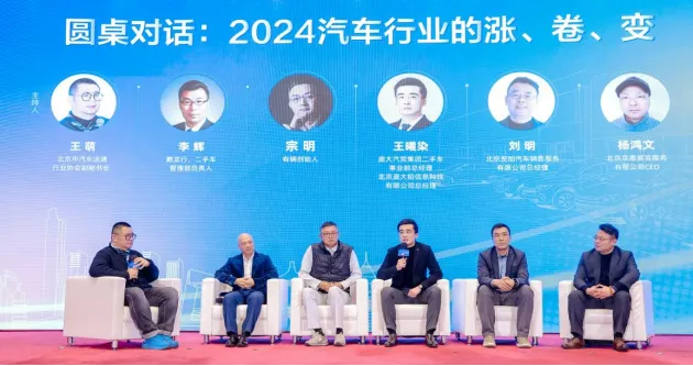 圆桌对话环节,鹏龙行二手车管理部负责人李辉、有辆创始人宗明、庞大汽贸集团二手车事业部总经理、北京庞大拍信息科技有限公司总经理王曦染、北京友加汽车销售服务有限公司总经理刘明、北京京惠展览服务有限公司CEO 杨鸿文,在协会王萌副秘书长主持下,就2024汽车行业的涨、卷、变展开了深度的互动交流。