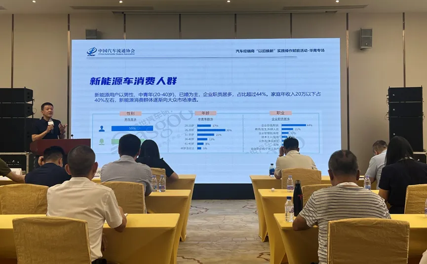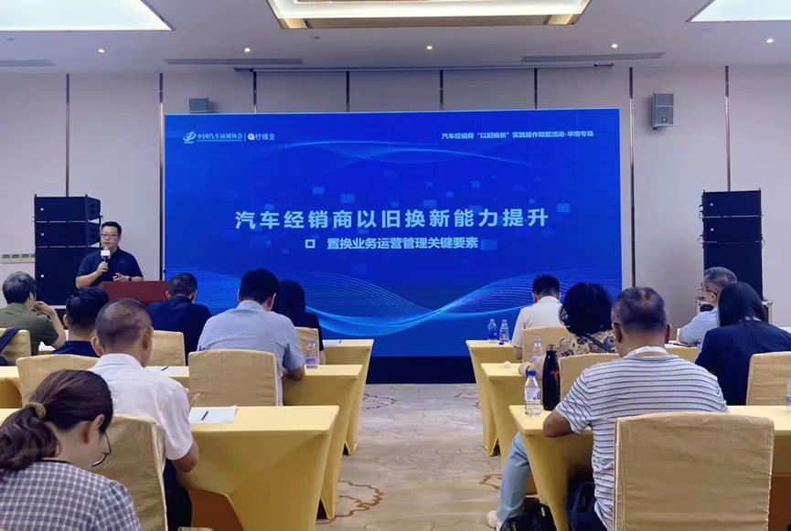 8月27日上午,由中国汽车流通协会主办,法兰克福展览(上海)有限公司与中国机械国际合作股份有限公司为支持单位,CADA柠檬查承办的汽车经销商”以旧换新”实践操作赋能活动-华南专场在广州国际汽车零部件及改装用品售后市场展览会现场成功举办。中国汽车流通协会会员部主任马悦,中国汽车流通协会数据应用与消费者研究分会副秘书长常亮,广东唯普汽车科技股份有限公司技术总监苏翔,厦门建发集团有限公司易手车负责人韩涛,CADA柠檬查销售总监段小玲,CADA柠檬查二手车业务专家柴京京出席了本次会议。广物汽贸、俊诚集团、建发集团、蓝池集团、粤宝集团、昊城集团、开心集团、兰天集团、南菱集团、大昌行集团、东风南方、长枫汽车、深圳立新出行等50余家汽车企业代表、二手车经销商代表等共60余人到场参会。