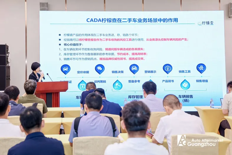 接着,CADA柠檬查销售总监段小玲发表了题为“二手车经营风险管理的策略与实践”主题发言。她表示,二手车行业的发展需要坚定不移地推动诚信体系建设,建设诚信透明交易环境才能够让消费者放心、安心地购买二手车。CADA柠檬查通过提供事故报告、维保报告、估值报告及新能源电池分析等全面的数据服务,构建车辆全生命周期档案,助力经销商规避盗抢、泡水等风险车辆,增强客户信任、推动成交。目前,平台已累计识别超过百万辆问题车辆,有效推动二手车市场向合规化、专业化方向发展,为经销商降本增效及行业生态优化提供核心支撑。