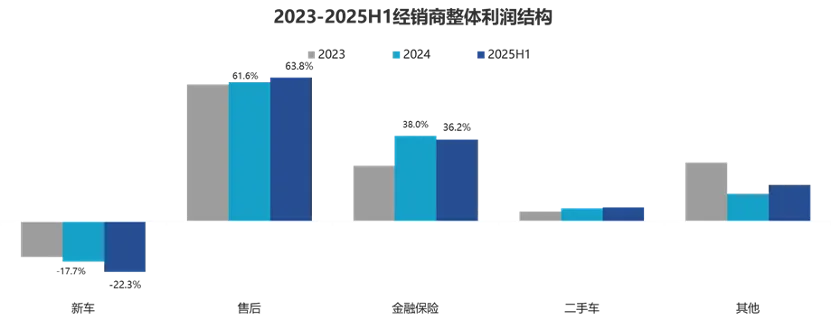 在经销商的毛利构成中,新车、售后和金融保险的毛利贡献分别为负22.3%、63.8%和36.2%。新车销售毛利贡献仍为负值。当下,售后服务毛利贡献略有增加,比如售后服务、汽车装饰等,而依靠高返佣汽车分期政策获得短暂毛利增长的金融保险较以往出现明显下降,冲击着脆弱的汽车经销生态。