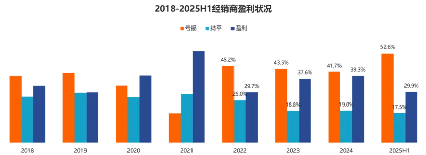 新车销售业务出现严重亏损,经销商资金压力显著增大,流动性紧张问题逐渐蔓延至整个汽车流通行业。调查数据显示,上半年经营亏损的经销商比例升至52.6%,盈亏平衡的占17.5%,实现盈利的仅为29.9%。