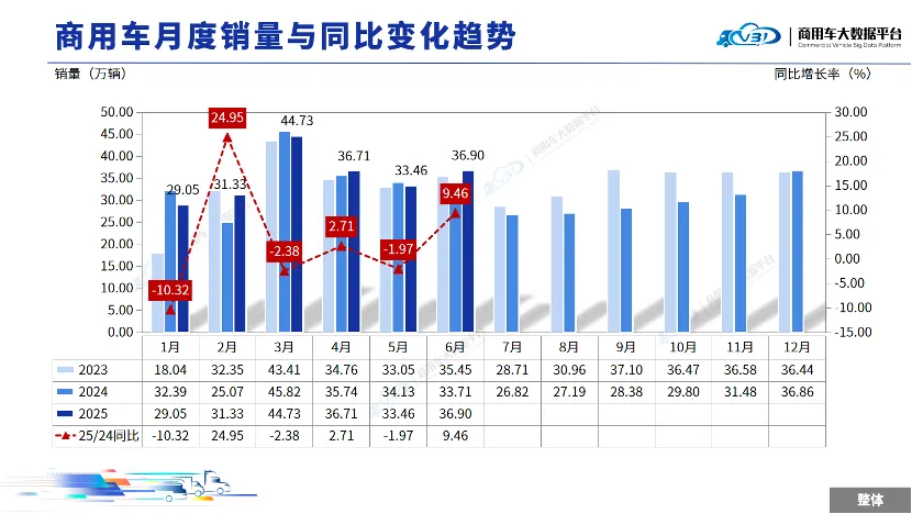 2025年上半年,在国家坚持稳中求进的总基调以及坚持推进供给侧改革的政策方针指导下,尽管商用车行业依然存在运费持续低迷,需求不足,投资信心不足,基建开工率低,核心零部件交付困难等因素,但是国家报废补贴以及以旧换新政策的持续发力,在一定程度上刺激了需求。与此同时,中国品牌海外市场的持续发力以及品牌影响度的日渐增强,出口销量持续走高,成为推动2025年上半年商用车销量增长的主力。