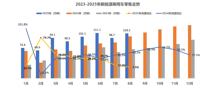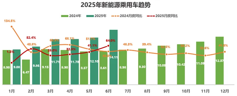 2025年上半年,国内乘用车市场累计零售量为1090.1万辆,同比增长10.8%,整体呈现强势复苏态势。在“两新”政策持续推动下,市场表现逐季走强:一季度零售量为512万辆,同比增长6.3%;二季度进一步提升至568.7万辆,同比增长13.6%。