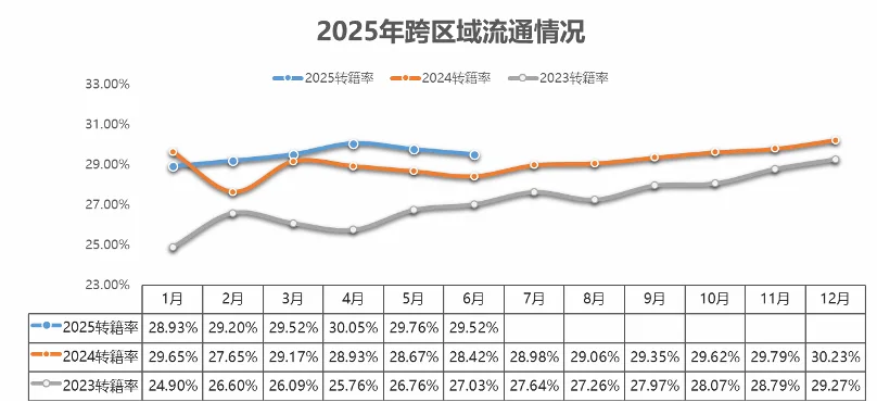 随着二手车新政的不断深入实施,二手车交易手续更加简便、交易成本也随之大幅度降低,特别是跨省通办与取消国五限迁,提高了交易效率,二手车市场的活跃度在不断提升。2025年上半年转籍率保持在29%左右,较同期增长了1.1个百分点。
