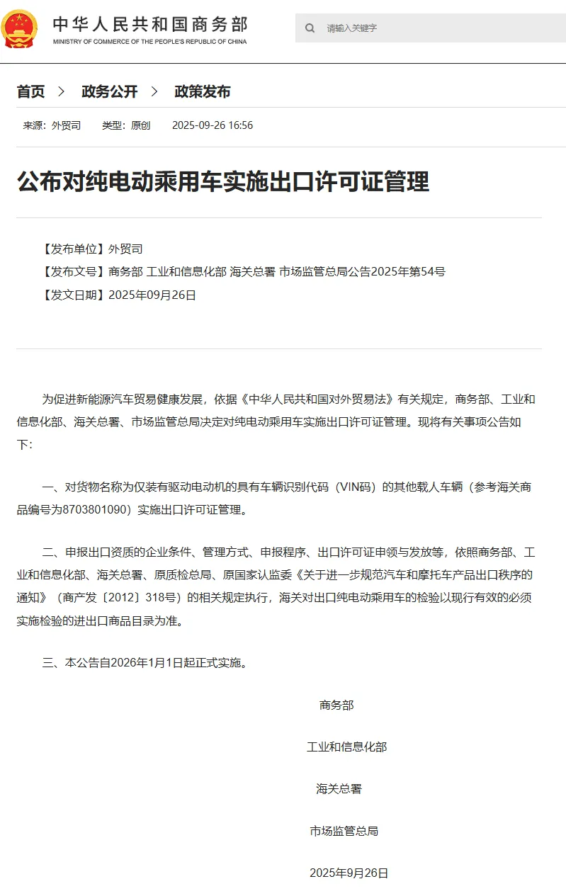 9月26日,商务部发布公告,为促进新能源汽车贸易健康发展,依据《中华人民共和国对外贸易法》有关规定,商务部、工业和信息化部、海关总署、市场监管总局决定对纯电动乘用车实施出口许可证管理。现将有关事项公告如下: