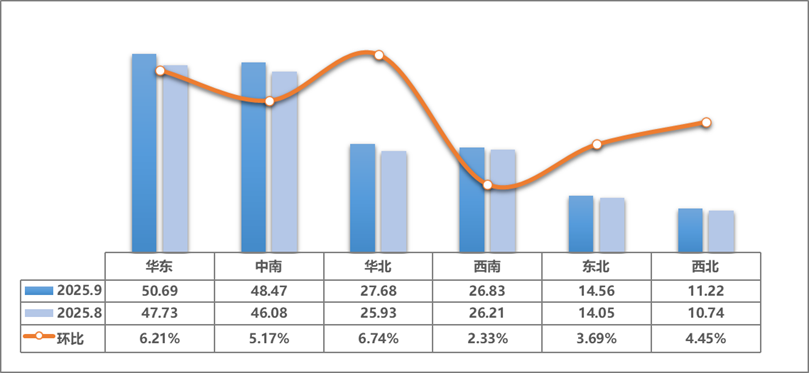 2025年9月,全国二手车市场交易量整体呈现稳健增长态势。从六大区市场表现来看,本月华东、华北及中南地区交易量增长尤为突出,其他区域也均实现了不同程度的正增长。