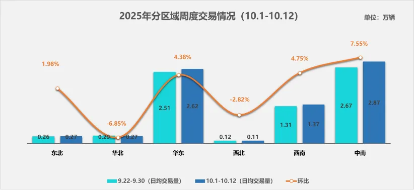 2025年10月1日-12日,二手车市场活跃度持续释放,日均交易量达7.51万辆,环比9月底增长4.98%。