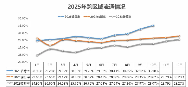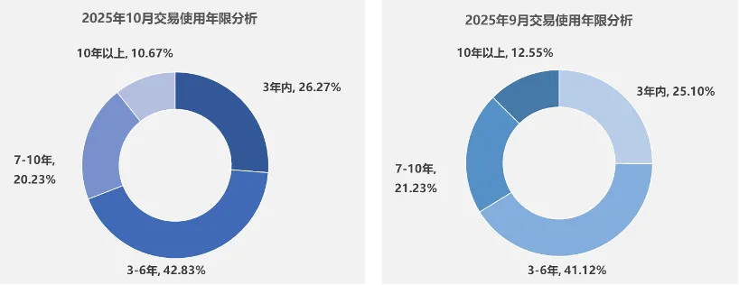 流通层面亮点突出,经销商为缓解资金压力主动加快库存周转,跨区域流通活力显著增强,10月外迁率达到33%,创下近三年新高,全国性流通网络活跃度持续提升。车龄结构上,7年及以上长车龄二手车占比升至30%,较同期增长近6个百分点,市场结构进一步调整。