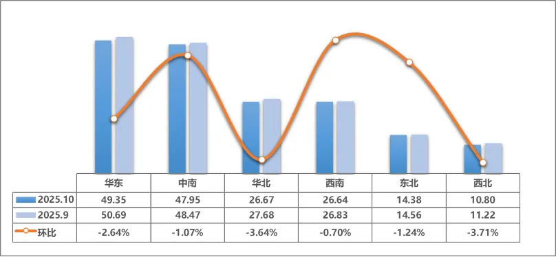 2025年10月,全国二手车市场交易量整体呈现小幅回落走势。从六大区市场表现来看,交易量环比均呈现不同程度的下滑。华北和西北地区降幅相对较为明显。