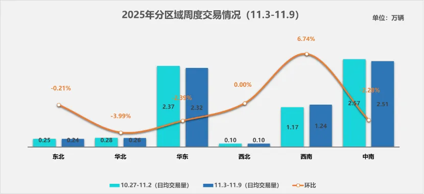 本周,二手车市场整体交易量较前一周呈现小幅下降走势。从各区域市场的具体表现来看,仅西南地区日均交易量有所增长,西北地区走势较为平稳。东北、华北、华东、中南四个区域均出现了不同程度的下滑。