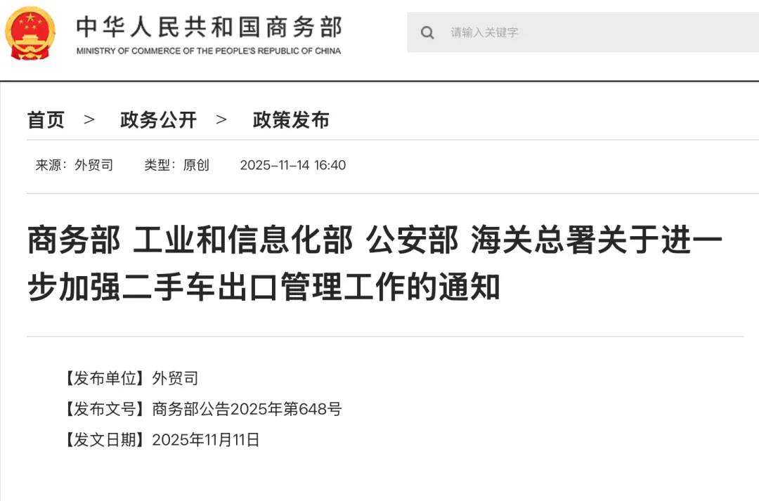 为深入贯彻落实党中央、国务院决策部署,进一步规范汽车产业竞争秩序,促进我国二手车出口健康有序发展,商务部、工业和信息化部、公安部、海关总署决定进一步加强二手车出口管理。现将有关事项通知如下: