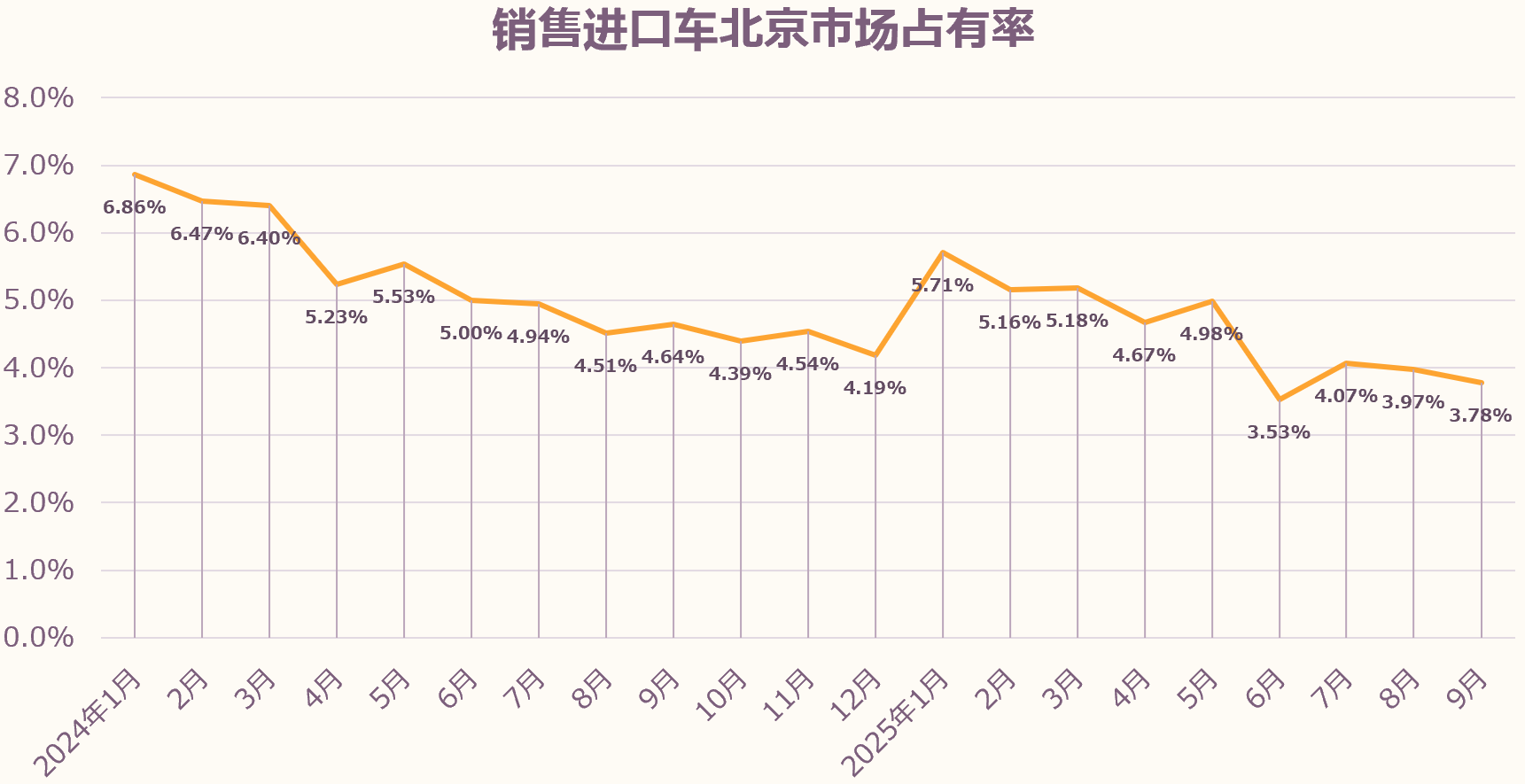 9月北京进口车销量占北京新车交易总量的3.78%,占有率环比下降0.19个百分点,同比下降0.86个百分点。