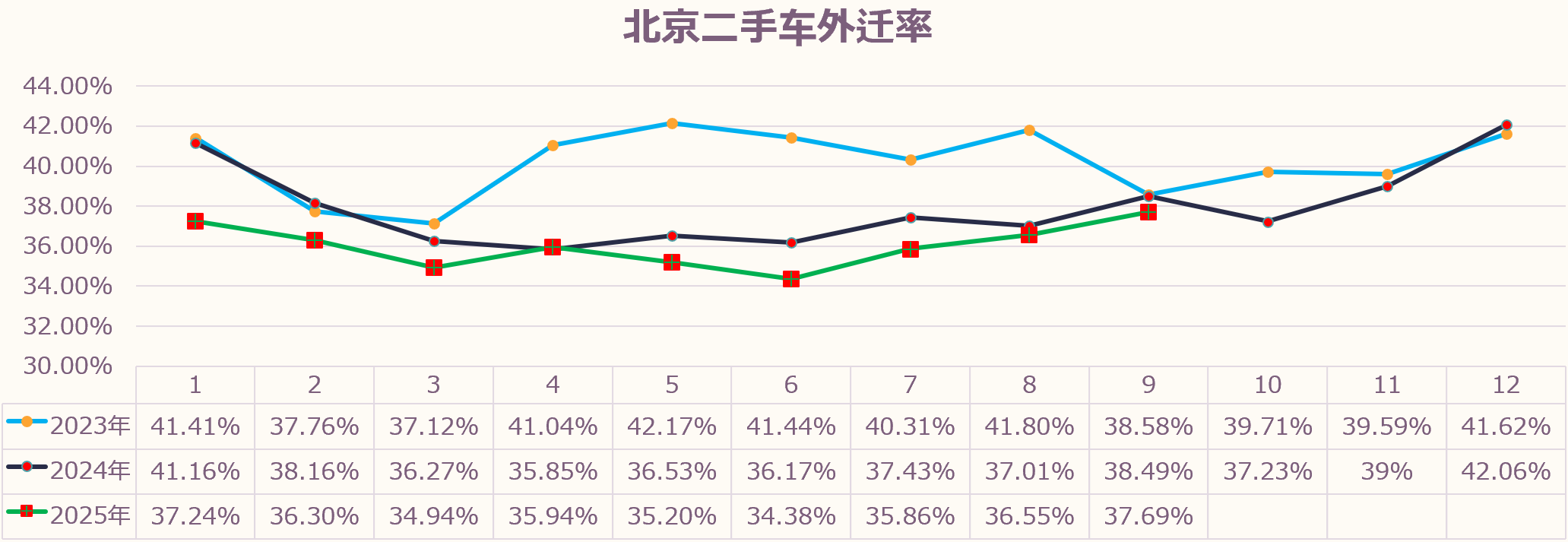 9月份北京二手车交易外迁率为37.69%,外迁率环比上升1.14个百分点,同比下降0.8个百分点。