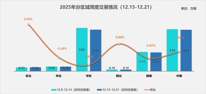 本周,二手车市场整体展现出小幅下行态势。从各区域市场的具体表现来看,华北、华东、西南以及中南地区,日均交易量均出现了小幅回落。东北地区则呈现出小幅上扬的走势,而西北地区本周的市场表现则相对平稳,未出现明显波动。