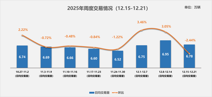 12 月 15 日至 21 日二手车市场日均交易量达到 6.78 万辆,相较于上周的高位水平小幅回落 2.44 个百分点,不过和 11 月同期相比仍实现 2.7% 的增长,当前市场依旧处在 12 月以来的上升通道中,预计 12 月全月交易量为180 万辆。