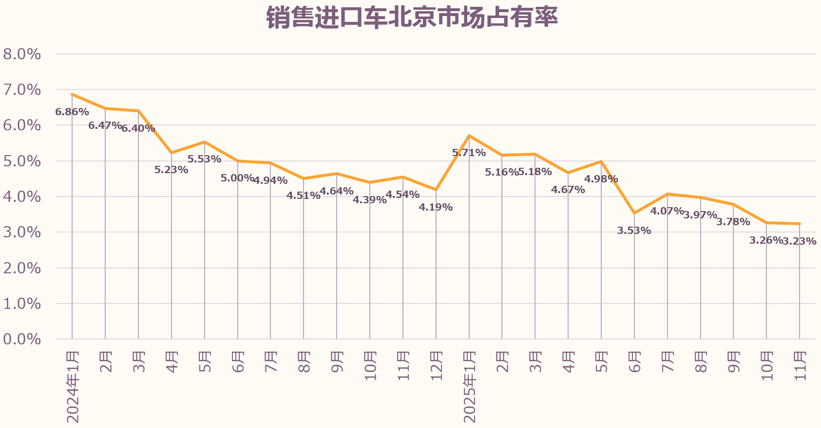 11月北京进口车销量占北京新车交易总量的3.23%,占有率环比下降0.03个百分点,同比下降1.31个百分点。