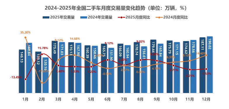 2025年12月,全国二手车市场交易量187.11万辆,环比增长7.15%,同比下降1.53%,交易金额为1206.72亿元。