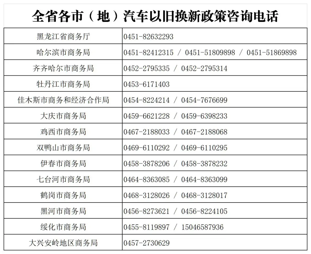 按照《国家发展改革委财政部关于2026年实施大规模设备更新和消费品以旧换新政策的通知》(发改环资〔2025〕1745号)、《商务部等7部门关于提质增效实施2026年消费品以旧换新政策的通知》(商消费函〔2025〕697号)及《商务部等8部门办公厅关于印发2026年汽车以旧换新补贴实施细则的通知》(商办消费函〔2025〕467号)要求,为释放汽车消费潜力、实施好2026年黑龙江省汽车以旧换新补贴政策,现将《2026年黑龙江省汽车以旧换新补贴实施细则》印发给你们,请贯彻执行。