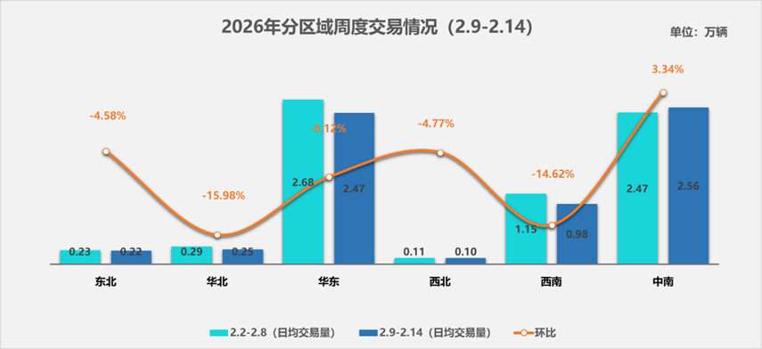 本周二手车市场交易态势整体下滑,日均交易量相较于前一周明显回落。分区域来看,市场表现差异显著:仅中南地区交易量小幅上扬,其余区域均呈下降态势,其中华东、华北、西南降幅更为明显。